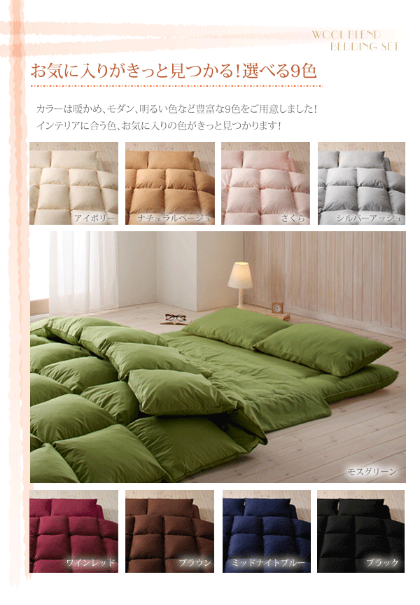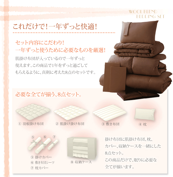 【最大1,000円OFF※期間限定】【セミダブル】寝具8点セット[羽根掛け布団+肌掛け布団+羊毛混ボリューム敷き布団(厚さ10cm)+枕+掛けカバー+敷き布団シーツ+枕カバー+収納ケース]【全9カラー】