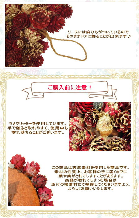 クリスマスツリーはこちら ・Spec 商品名 ナチュラルリース Mサイズ 素材 ドライリーフ 染木の実 ピックなど 吊り下げ用の麻ひも サイズ (11) w約33cm×h約33cm×d約6cm 重さ:約310g (14) 直径約34cm×d約8cm 重さ:約580g (ハンドメイドのため多少の誤差がございます) 注意 ※天然素材を使用した商品ですので、素材の性質上葉や実が取れてしまうことがあります。