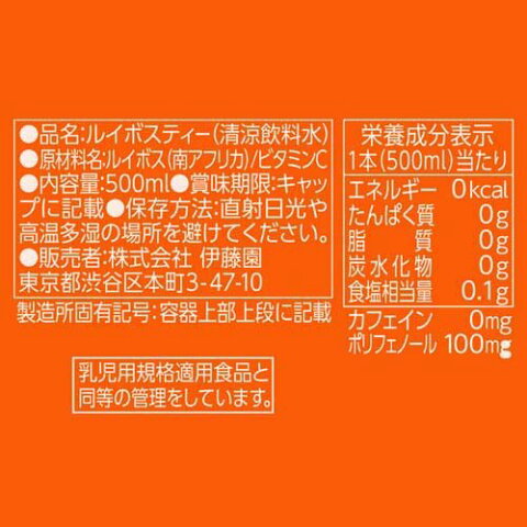 【品名・名称】清涼飲料水【伊藤園 ヘルシールイボスティーの原材料】ルイボス【栄養成分】1本(500mL)当たりエネルギー:0kcaL、たんぱく質:0g、脂質:0g、炭水化物:0g、食塩相当量:0.1g、カフェイン:0mg、ポリフェノール:100mg【保存方法】直射日光や高温多湿の場所を避けて保存してください。